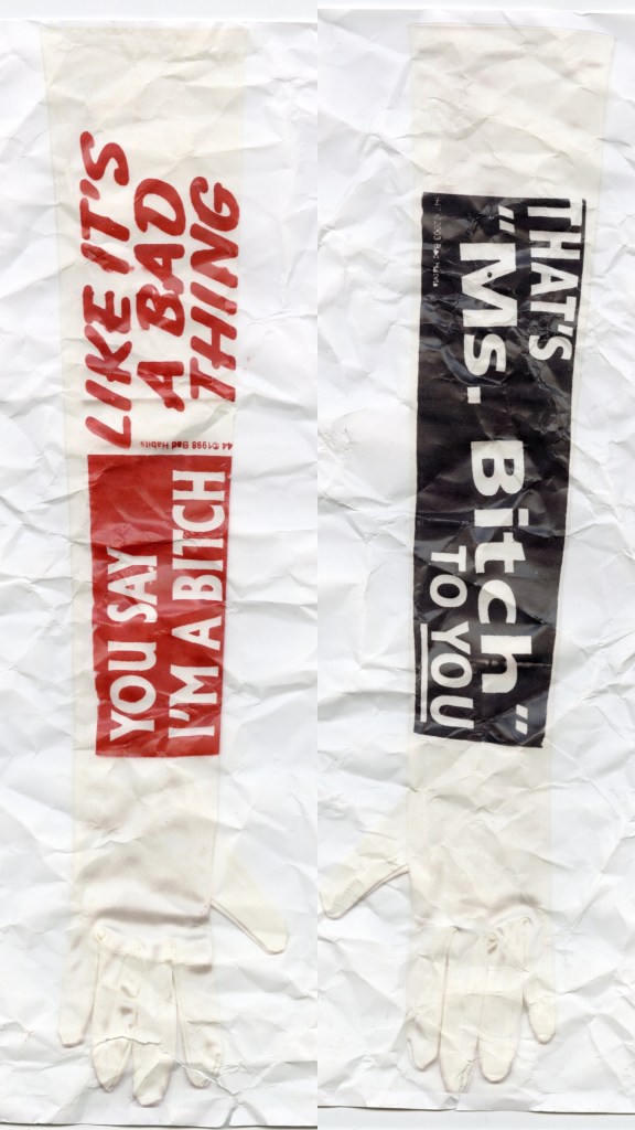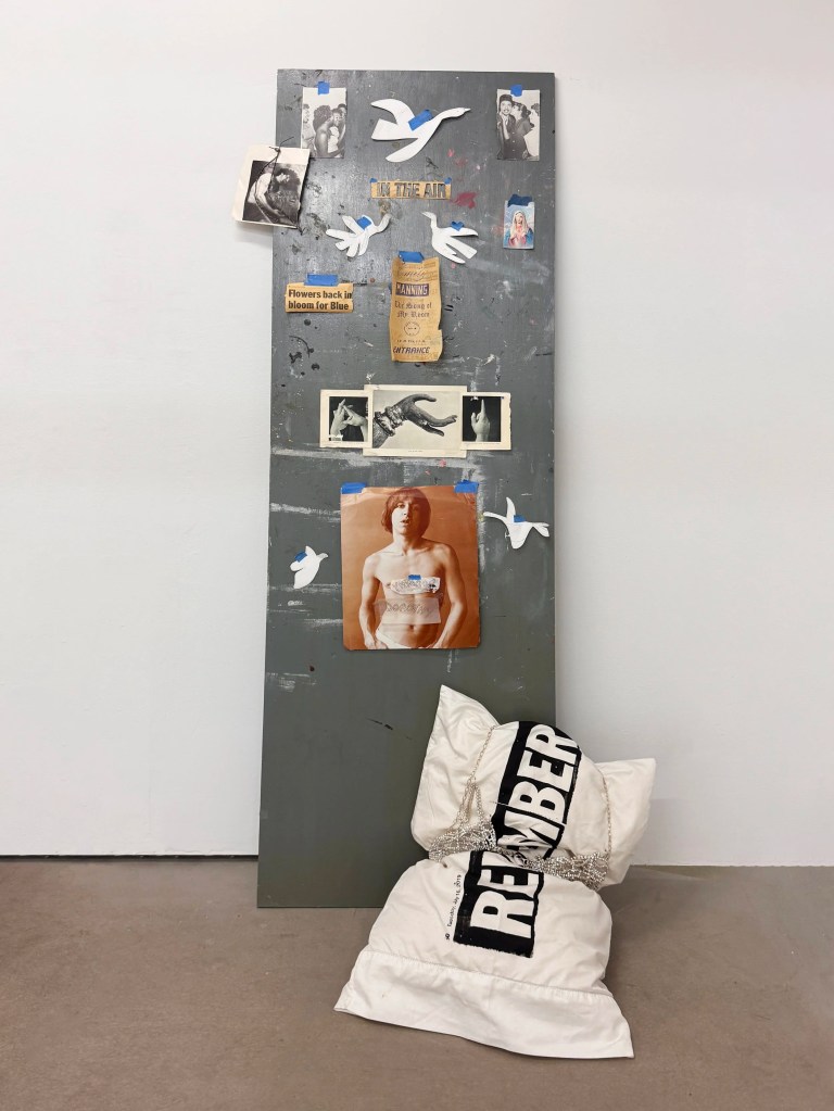 Plywood with varied printed ephemera. Cotton pillow with plastisol screenprint and rhinestone bra